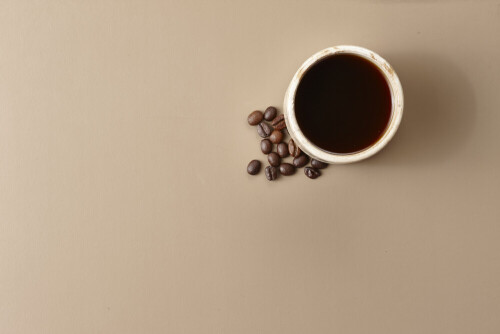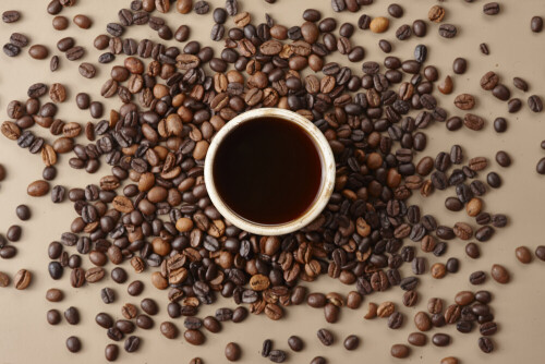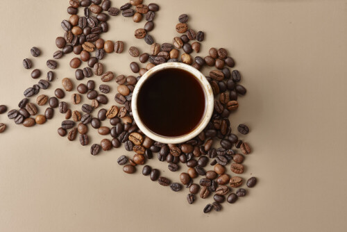 فنجان قهوة من الفخار البيج محاط بحبوب قهوة محمصة على خلفية بيج