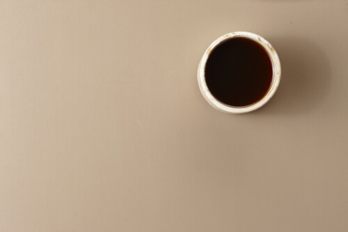فنجان قهوة من الفخار البيج محاط بحبوب قهوة محمصة على خلفية بيج