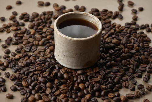 فنجان قهوة من الفخار البيج محاط بحبوب قهوة محمصة على خلفية بيج