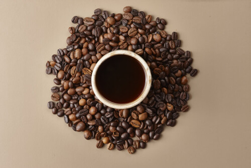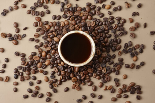 فنجان قهوة من الفخار البيج محاط بحبوب قهوة محمصة على خلفية بيج