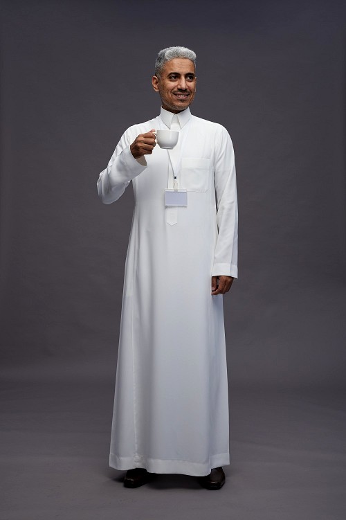 Saudi man wearing thob with neck strap employee badge standing holding mug on gray background