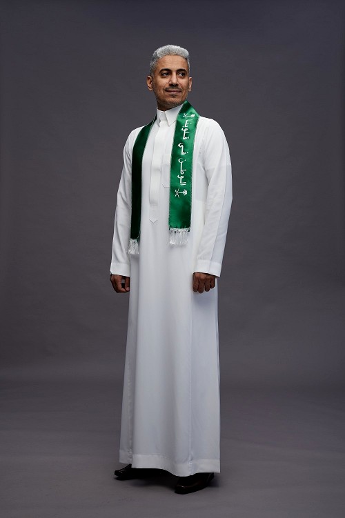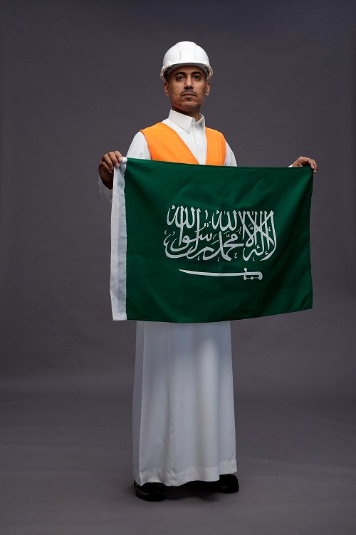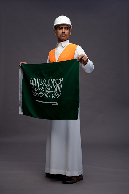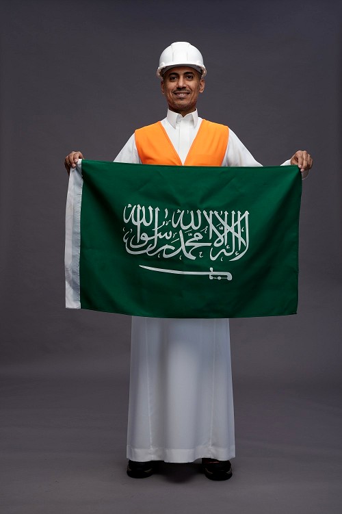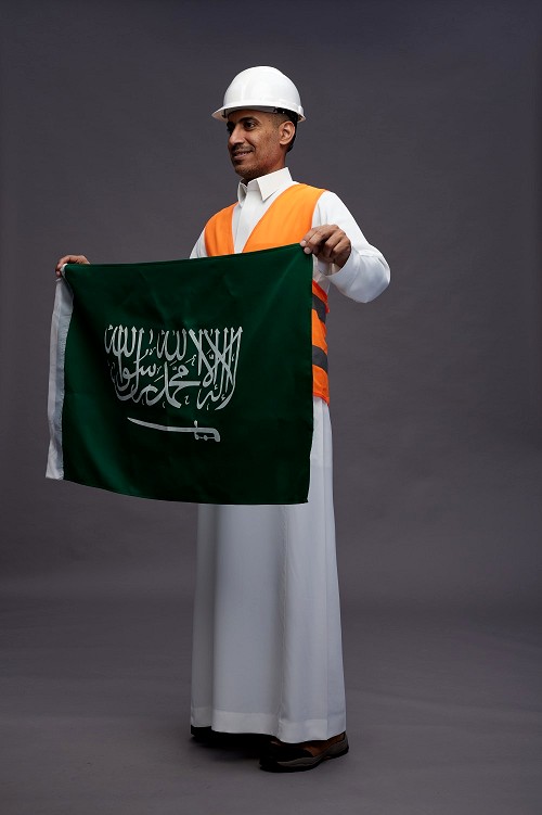 Saudi man wearing thob standing holding Saudi flag on gray background