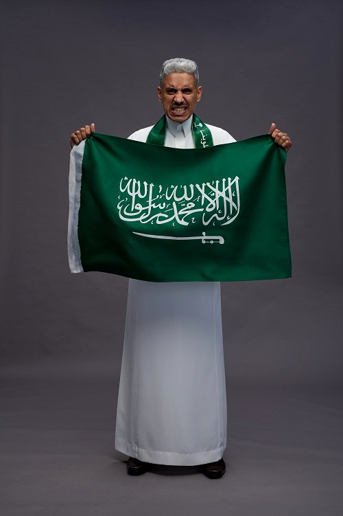 Saudi man wearing thob standing holding Saudi flag on gray background