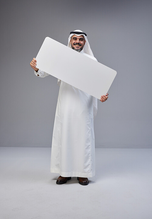 Saudi man Wearing Thob and white Shomag standing holding board on Gray background