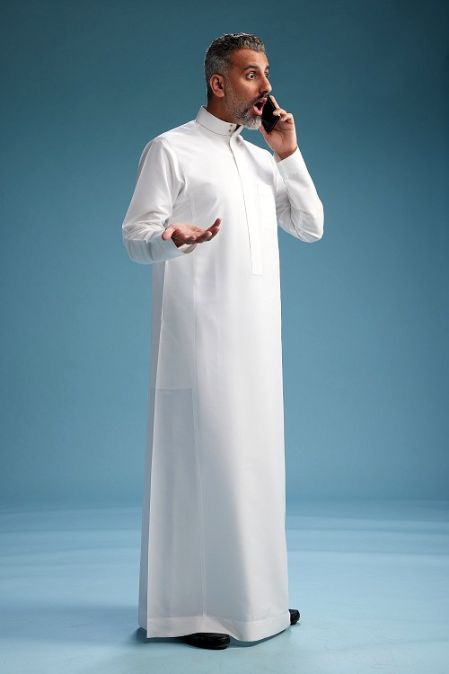 Saudi man wearing thob talking on the phone on blue background