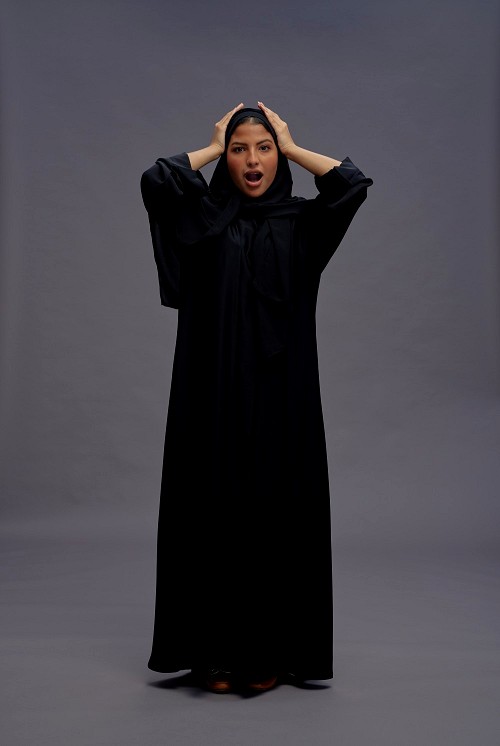 Saudi woman wearing Abaya standing hands behind head on gray background