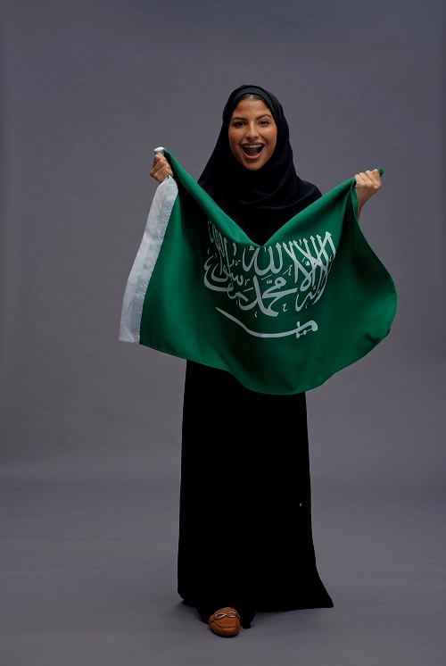Saudi woman wearing Abaya standing holding Saudi flag on gray background