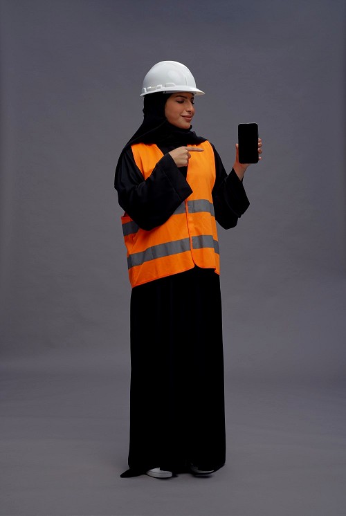 Saudi woman wearing Abaya with engineer vest standing showing phone to camera on gray background
