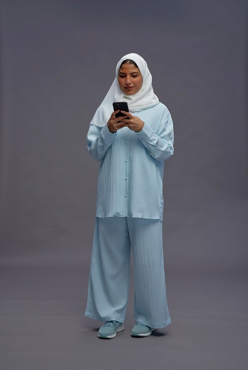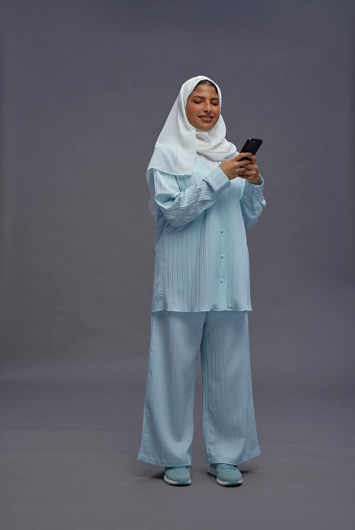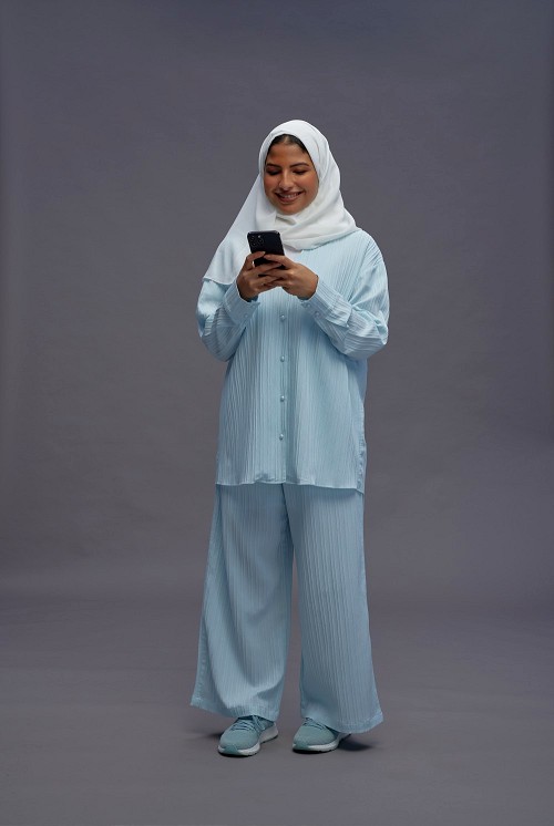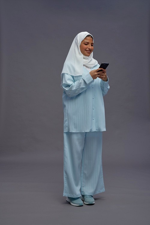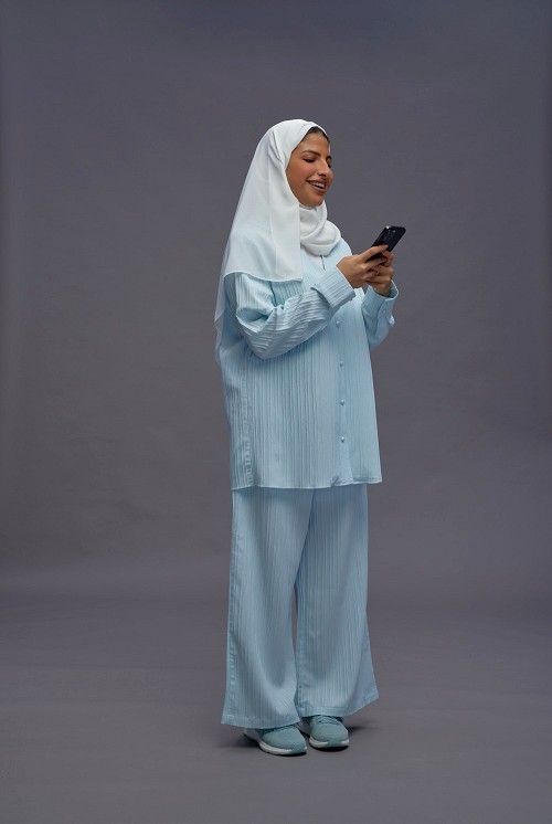 Saudi woman wearing hijab clothes standing texting on phone on gray background