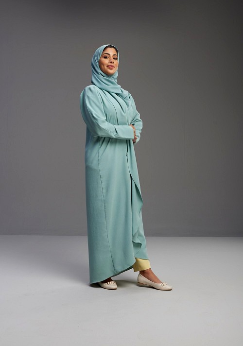 Saudi Woman wearing Abaya standing interacting with the camera on Gray background