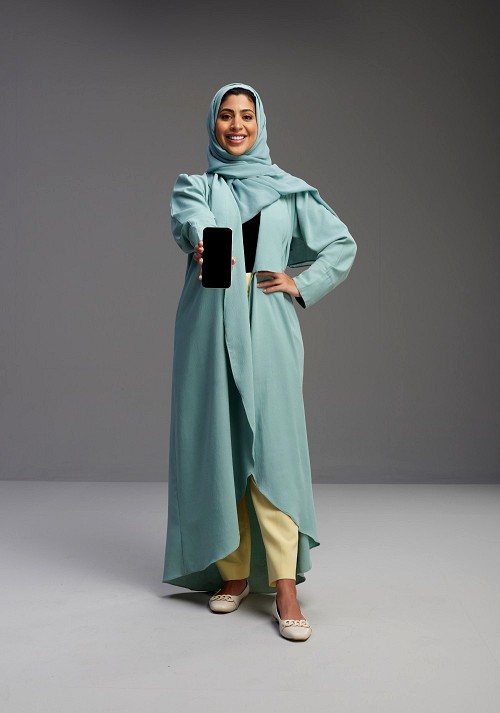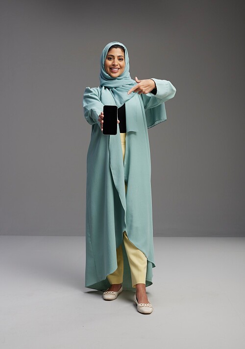 Saudi Woman wearing Abaya standing showing phone to camera on Gray background