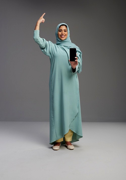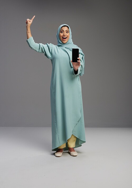 Saudi Woman wearing Abaya standing showing phone to camera on Gray background