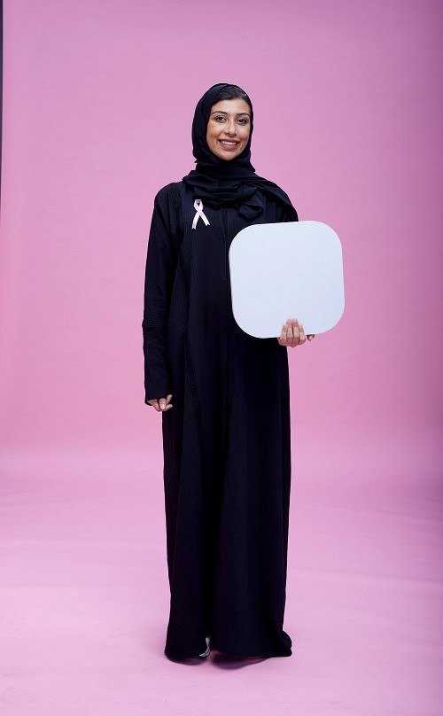 امرأة سعودية ترتدي عباية بشريطة زهرية وتقف وهي تحمل علامات وسائل التواصل الاجتماعي على خلفية زهرية