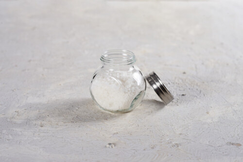 وعاء زجاجي ممتلئ بملح البحر الخشن على خلفية بيضاء