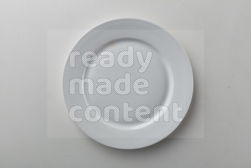 Top-view shot of a circular white plate on white background