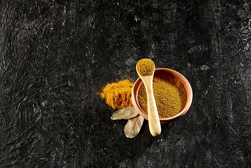وعاء خشبي وملعقة خشبية مملوءة بمسحوق الكركم على أرضية سوداء