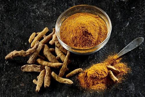 وعاء زجاجي وملعقة معدنية ممتلئان ببودرة الكركم وأصابع الكركم المجففة بجانبهما على خلفية سوداء