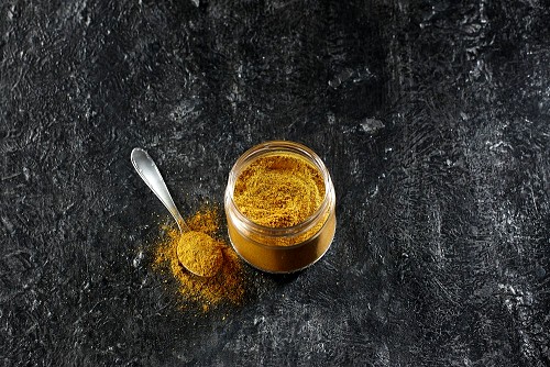 وعاء زجاجي وملعقة معدنية ممتلئان ببودرة الكركم على خلفية سوداء