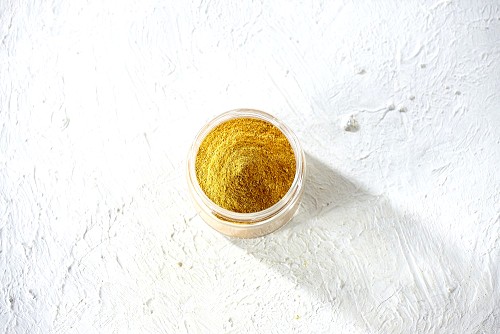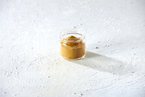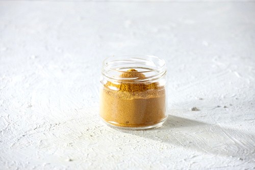 وعاء زجاجي ممتلئ ببودرة الكركم على خلفية بيضاء