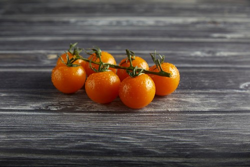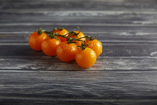 45 degree vein of roma tomato tomato on a textured grey wooden background