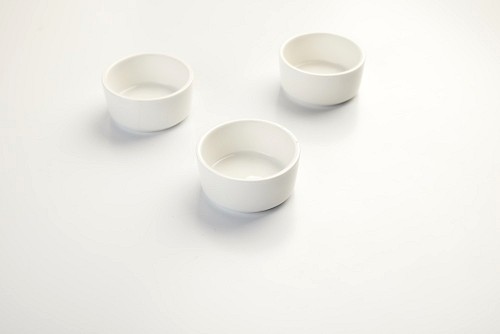 white ceramic round sauce dish on white countertop