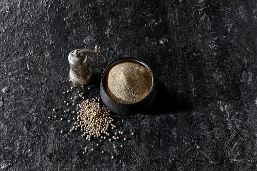 وعاء فخار أسود مملوء ببودرة الفلفل الأبيض مع حبات الفلفل ومطحنة الفلفل المعدنية على أرضية سوداء