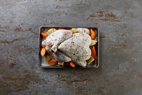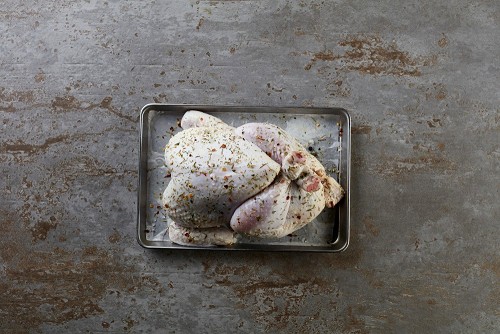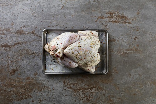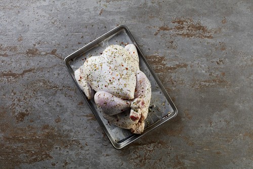 whole Raw chicken on a small oven trey direct on a rustic grey background