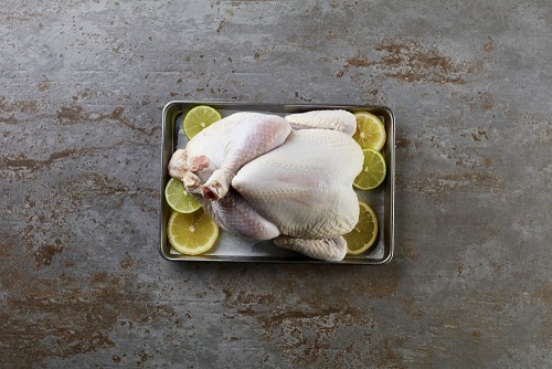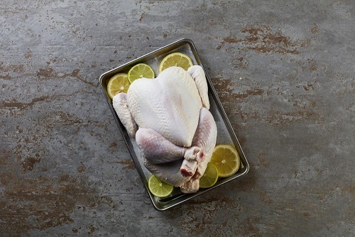 whole Raw chicken on a small oven trey direct on a rustic grey background