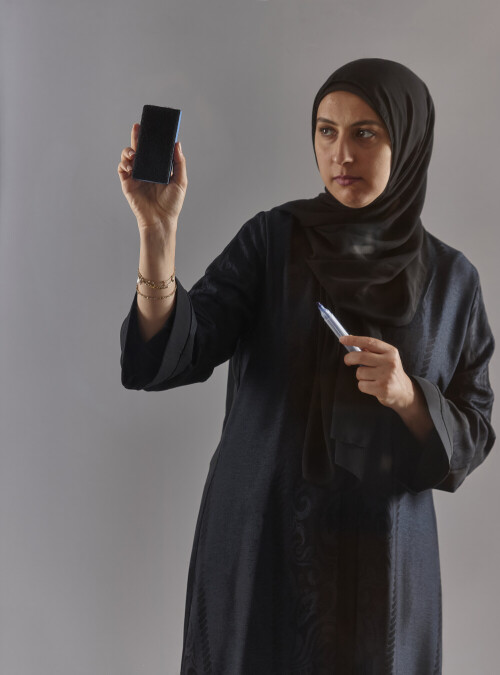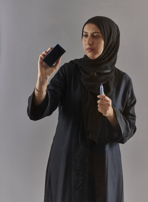امرأة ترتدي عباءة سوداء وحجاب وتمسك بقلم للكتابة على لوح شفاف مع ردود فعل وتعبيرات مختلفة على خلفية رمادية