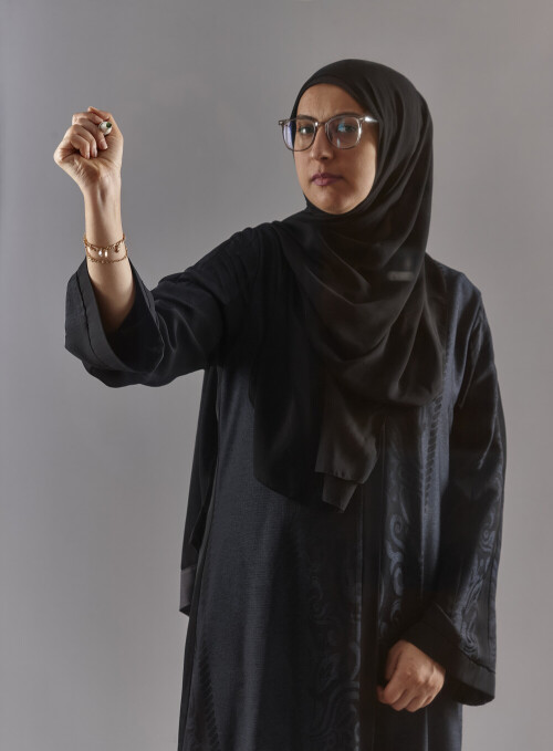 امرأة ترتدي عباءة سوداء وحجاب ونظارة وتمسك بقلم للكتابة على لوح شفاف مع ردود فعل وتعبيرات مختلفة على خلفية رمادية