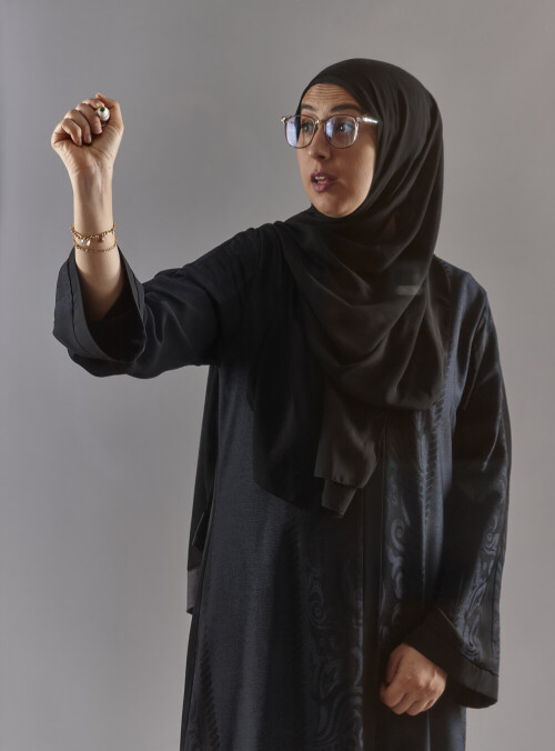 امرأة بالعباءة تكتب على لوح شفاف