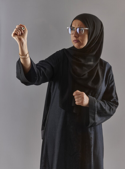 امرأة ترتدي عباءة سوداء وحجاب ونظارة وتمسك بقلم للكتابة على لوح شفاف مع ردود فعل وتعبيرات مختلفة على خلفية رمادية