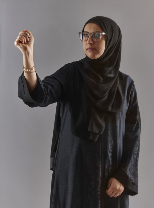 امرأة بالعباءة تكتب على لوح شفاف