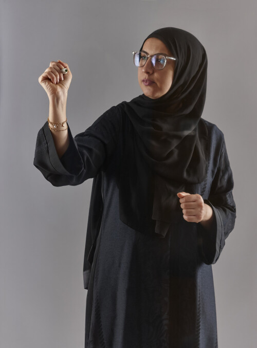 امرأة ترتدي عباءة سوداء وحجاب ونظارة وتمسك بقلم للكتابة على لوح شفاف مع ردود فعل وتعبيرات مختلفة على خلفية رمادية