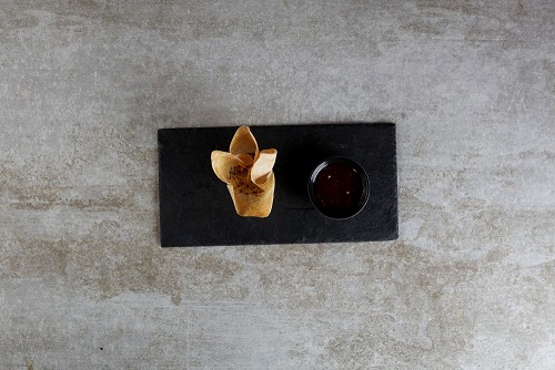 wonton cups with soy sauce ramkin on rectangle slate on grey textured counter top