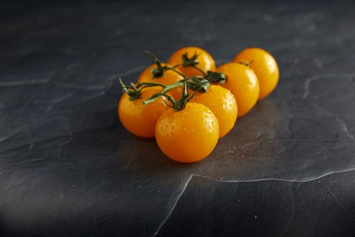 Yellow cherry tomato vein on a textured black slate background 45 degree