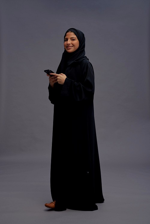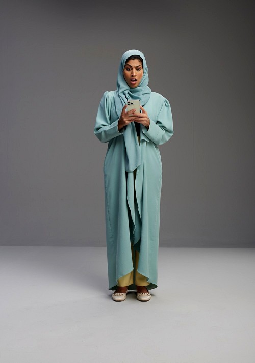 A Saudi woman having a call in a blue background wearing offwhite Abaya Hijab