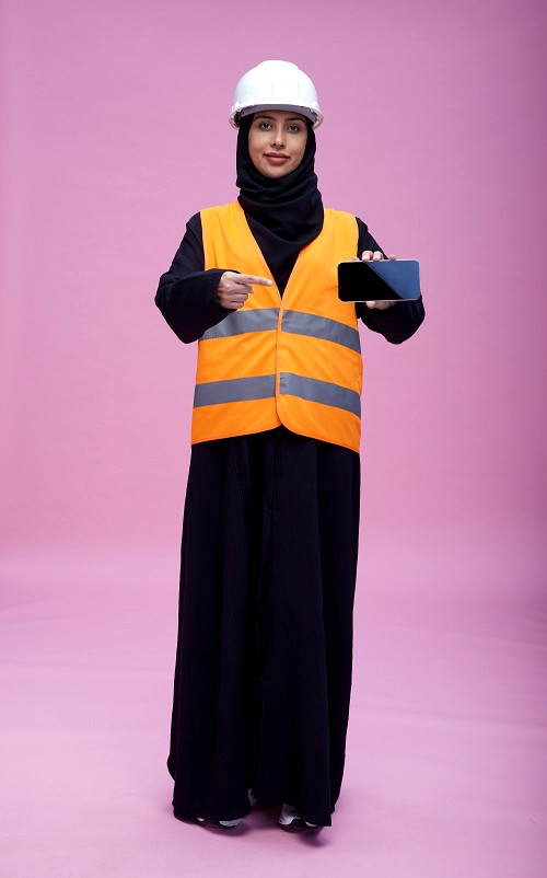 A Saudi woman Showing Her Phone Screen sitting in blue chair