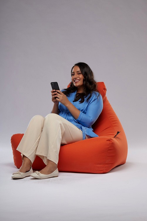 A woman sitting on a beanbag
