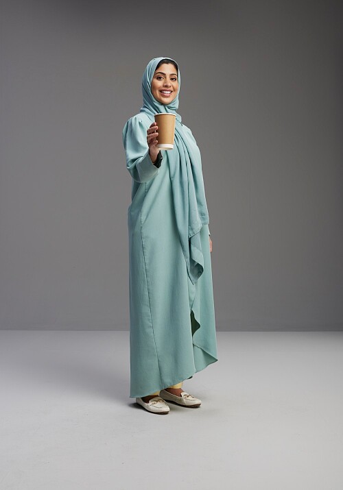 A Saudi woman having a call in a blue background wearing offwhite Abaya Hijab