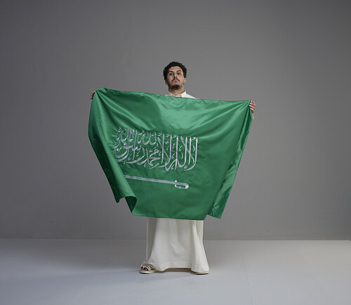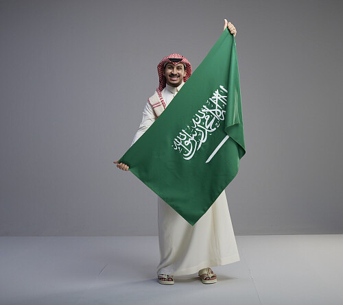 A Saudi man holding Saudi flag