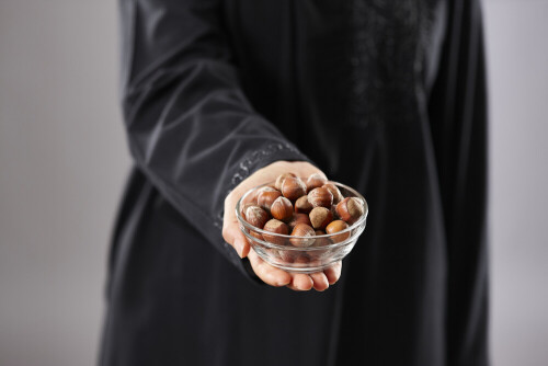 A Saudi woman Holding a Camera on a Yellow Background wearing Brown Abaya with Hijab