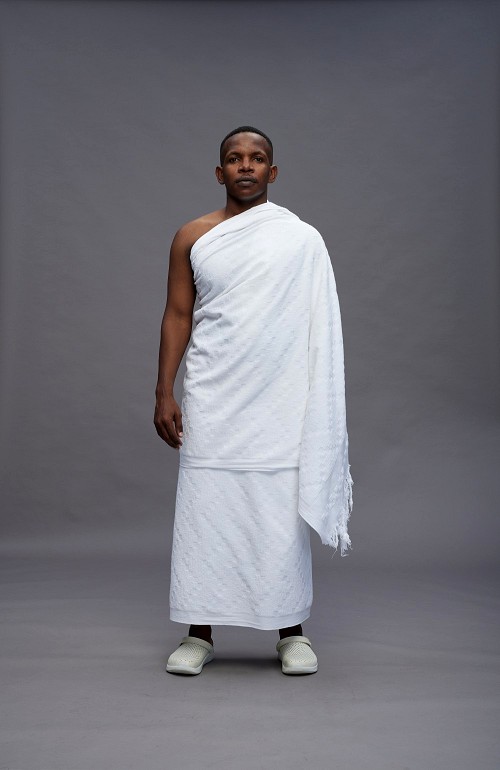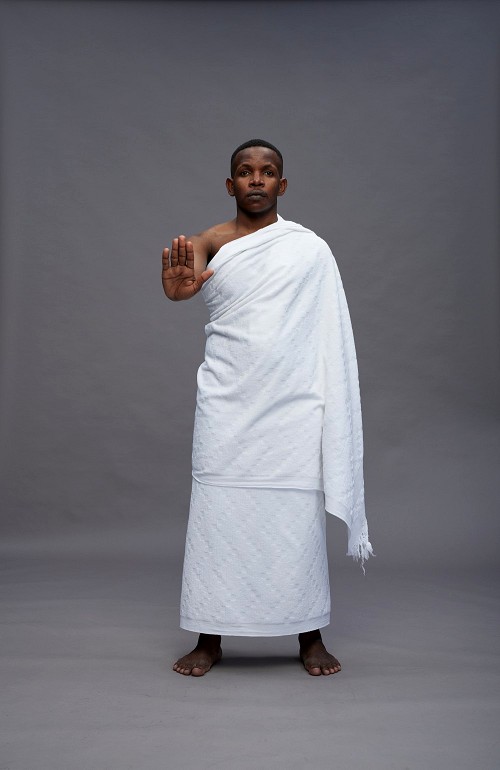 A man wearing Ehram Standing Interacting with the camera on gray background