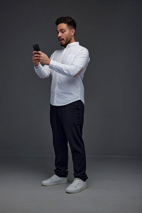 A man wearing smart casual standing and using his phone eye level on a gray background