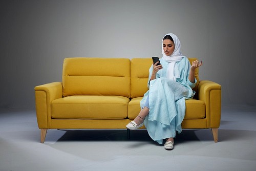 A Saudi woman wearing a light blue Abaya and white head scarf sitting on a yellow sofa and texting on her phone on a grey background
