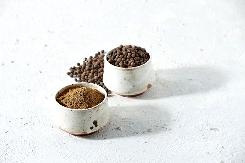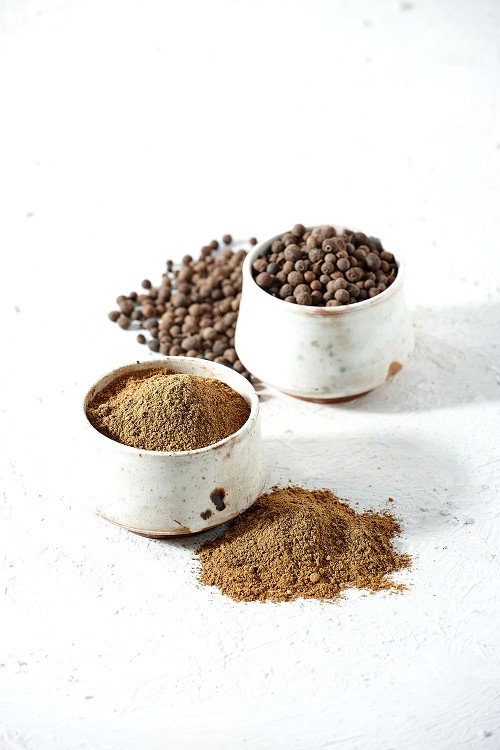 2 beige bowls, one full of powder and the other full of whole balls with balls and powder spreaded on a textured white flooring