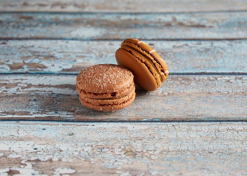 45º Shot of of two assorted Brown Irish Cream, and Brown Hazelnuts macarons  on light blue background