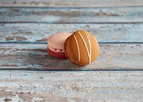 45º Shot of of two assorted Brown Irish Cream, and Pink Litchi Raspberry macarons on light blue background
