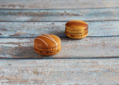 45º Shot of of two assorted Brown Irish Cream, and Yellow Crème Brulée macarons on light blue background