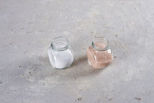 2 glass jars one is full of fine himalayan salt and the other with table salt on white background